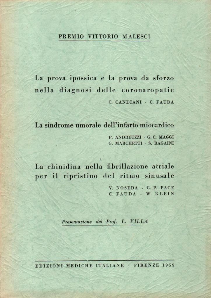 "Prova ipossica e la prova da sforzo nella diagnosi delle coronaropatie - La sindrome umorale dell'infarto miocardico - La chinidina nella fibrillazione atriale per il ripristino del ritmo sinusale", edizione 1959, pp. 325, formato 17 x 25.